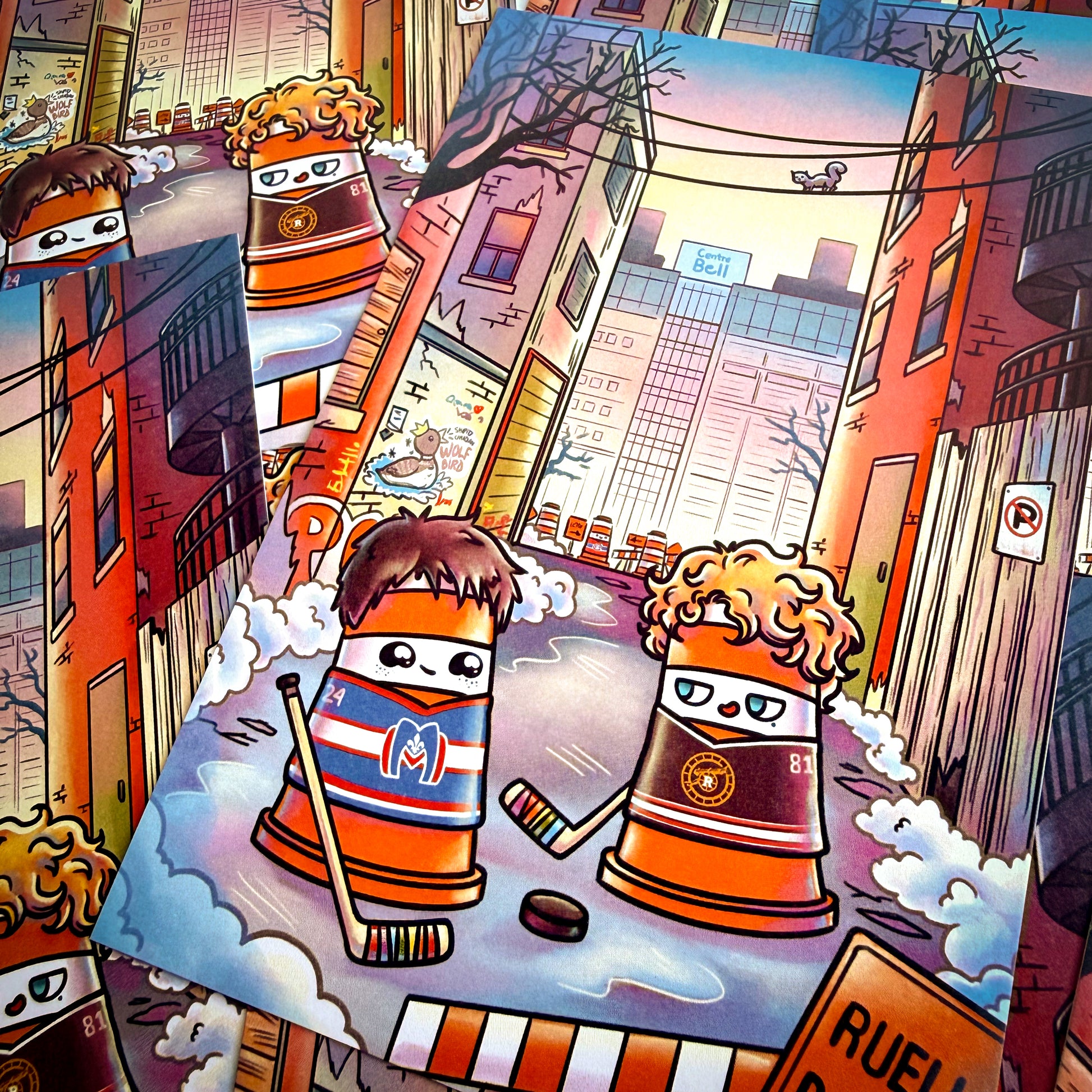 Here's a postcard inspired by the popular Canadian series; Heated Rivalry. When I saw that part of the story is taking place in Montreal, I had to draw Shane and Ilya as orange cones playing hockey in an alley. These are a limited edition, so get yours while you can.
