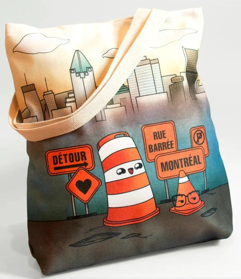 This is the tote bag for every Montrealer or construction fan! It features Ponto and Gerald with construction signs in front of the Montreal skyline. The bag is made with vibrant printed canvas and natural cotton handles. It's very sturdy and can hold a lot of items such as books, shopping items, groceries and even your Ponto plushie!.